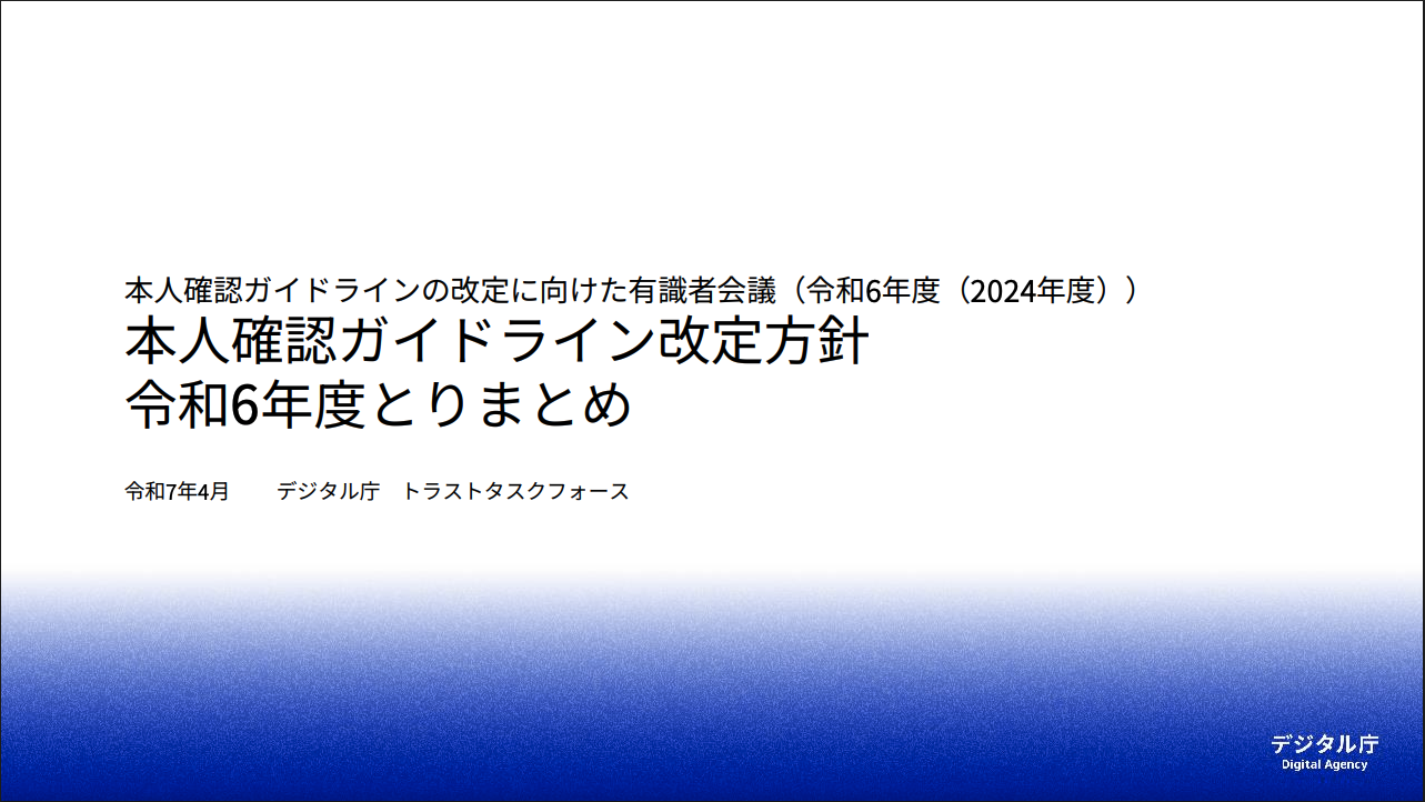 4月1日、デジタル庁から本人確認ガイドラインの改定に向けた有識者会議(令和6年度)の取りまとめが公表されました。「DS-500 行政手続におけるオンラインによる本人確認の手法に関するガイドライン」(通称「本人確認ガイドライン」)は、行政手続きをデジタル化する時に、安全に本人確認するためのルールや方法をまとめたものです。例えるなら、オンラインでの「本人確認の教科書」みたいなものですね。このガイドラインは、アメリカのNISTという機関が作ったガイドラインなどを参考にしつつ、マイナンバーカードを使った本人確認など、日本独自のやり方も取り入れています。