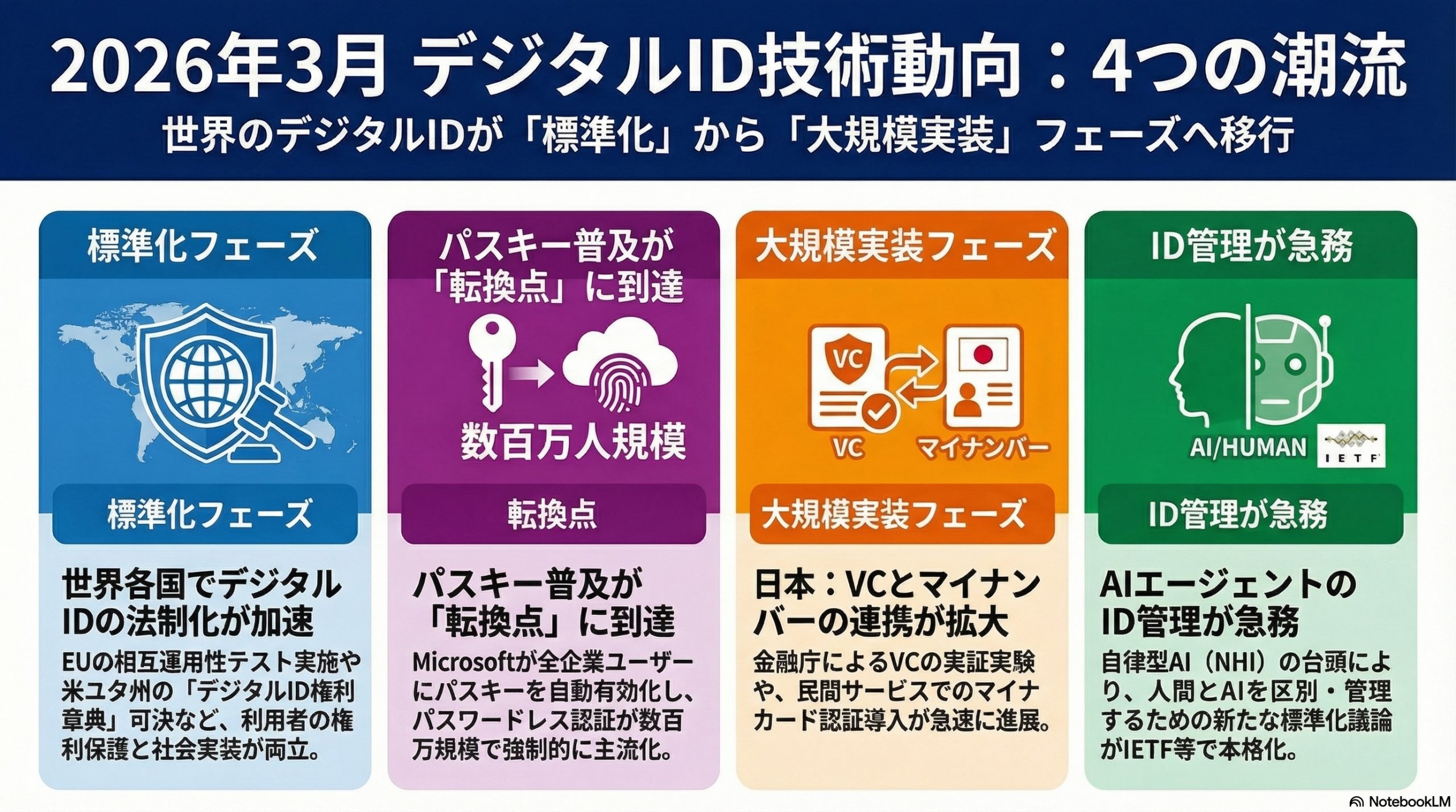 2026年3月のDigital Identity(デジタルアイデンティティ)分野では、各国の法整備や実証実験の進展、パスキーの普及、そしてAIエージェントの台頭に伴う新たなアイデンティティ管理の課題が顕著になりました。以下に主要な動向を分野別にまとめます。